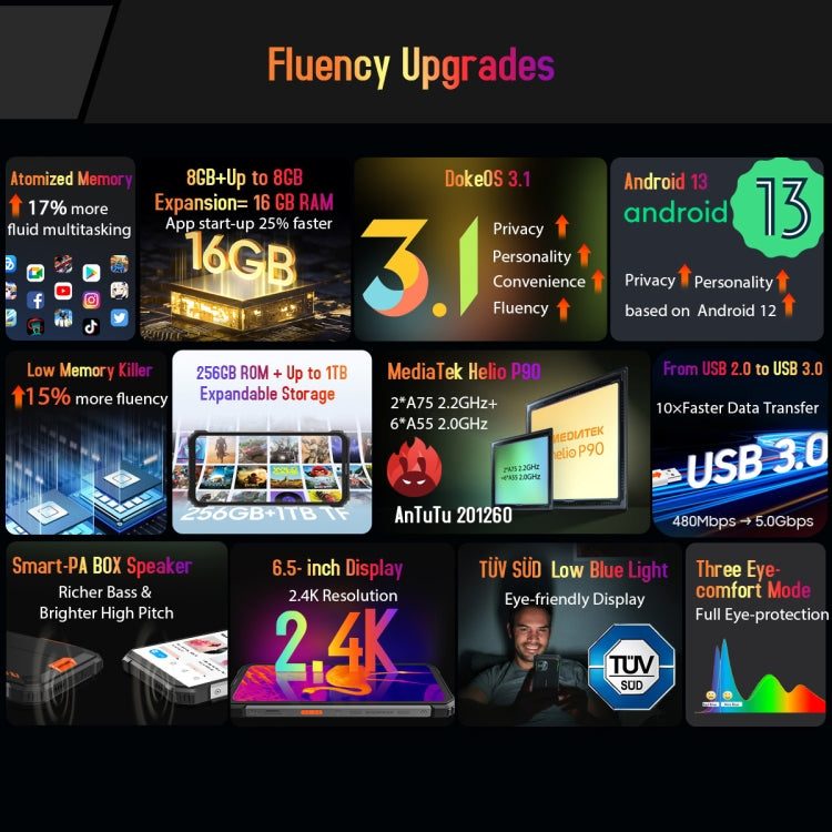 • Procesador y memoria: Helio P90 Octa Core hasta 2,2 GHz con 8 GB RAM y 256 GB de almacenamiento.