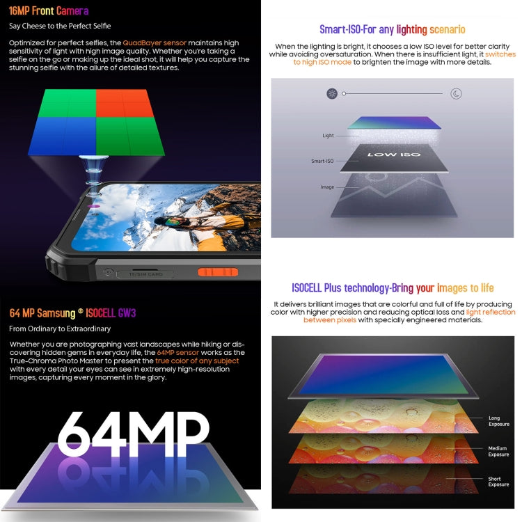 • Cámara trasera y sensor térmico: Cámara principal 64 MP con flash y sensor GC5035 5 MP para imágenes térmicas.