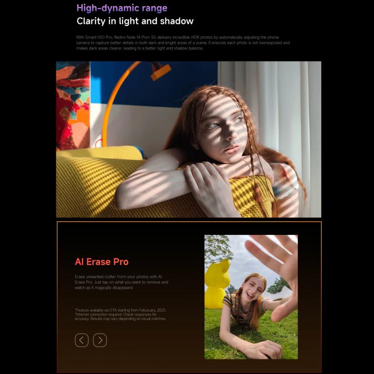 El Xiaomi Redmi Note 14 Pro+ 5G Global es un smartphone premium diseñado para usuarios exigentes que buscan potencia, cámara avanzada y autonomía. Con Snapdragon 7s Gen 3 y 8 GB + 256 GB, ofrece rendimiento fluido para multitarea, juegos y edición, mientras que su pantalla AMOLED CrystalRes de 6,67" y 120 Hz garantiza imágenes nítidas y desplazamiento ultra suave. Ideal para creadores de contenido y profesionales móviles que desean conectividad 5G y funciones inteligentes impulsadas por IA.